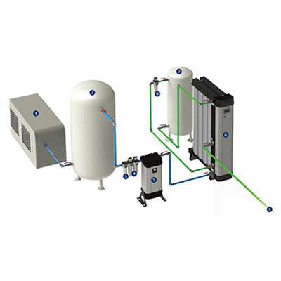 要在儲氣罐后安裝英國WALKER三級壓縮空氣過濾器,使得過濾后的壓縮空氣符合ISO 8573-1:2000顆粒等級的1級標(biāo)準(zhǔn),固體顆粒小于0.01μm,含油等級也為1級標(biāo)準(zhǔn),最大含油量0.003mg/m3;壓縮空氣干燥,要在SRA三級壓縮空氣過濾器后加裝SR模塊化吸干機?,這種吸干機是英國制造的無熱吸附式干燥機,利用變壓吸附原理實現(xiàn)壓縮空氣的干燥,一般壓力露點可以達(dá)到-40℃,更高的壓力露點為